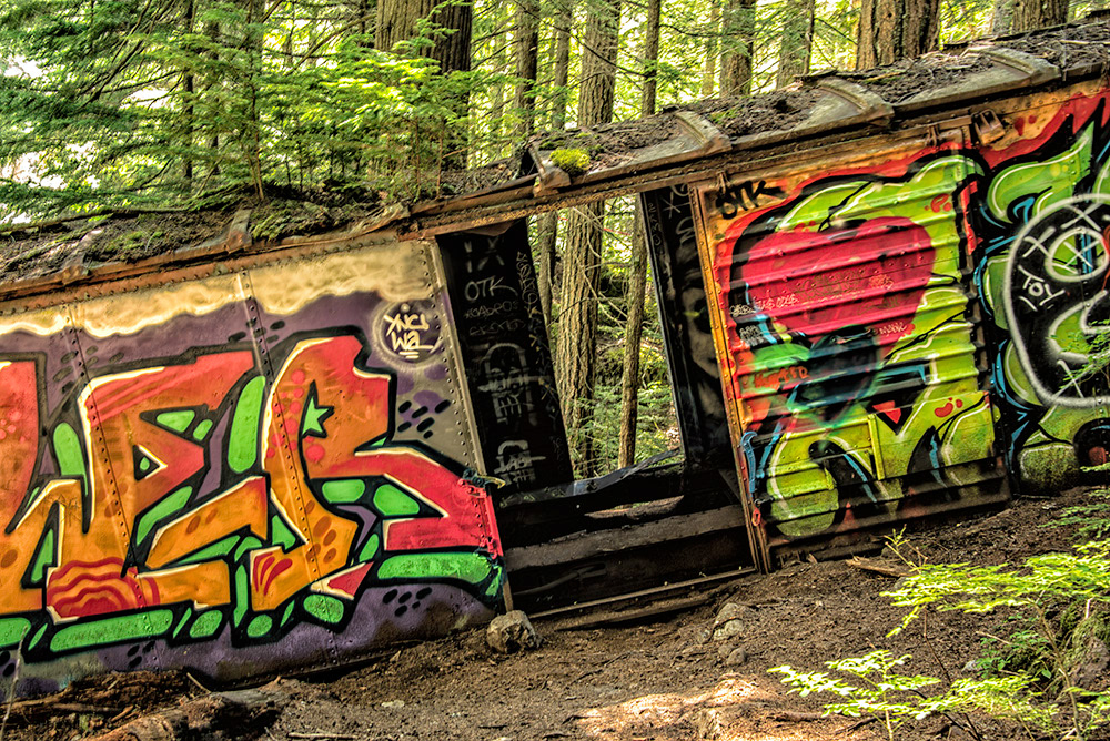 The train wreck is about six km from Whistler, BC, the box cars that were used to transport lumber, have sat for many years and now farm a colourful creative artspace.