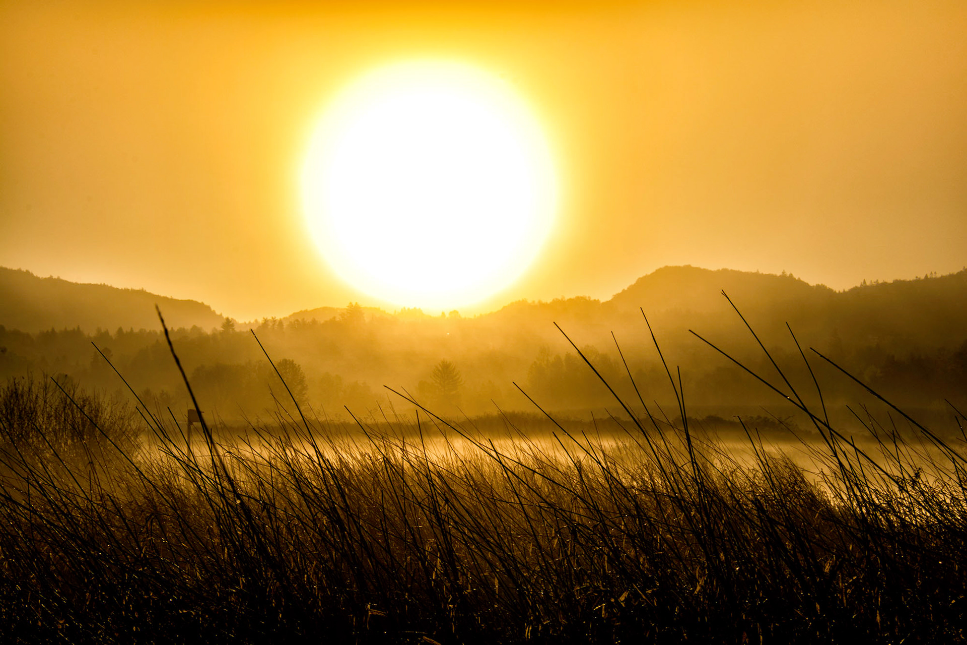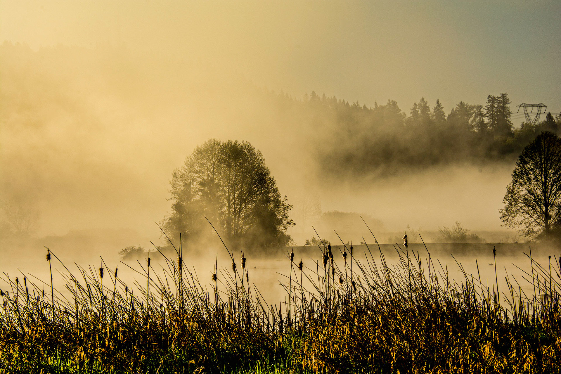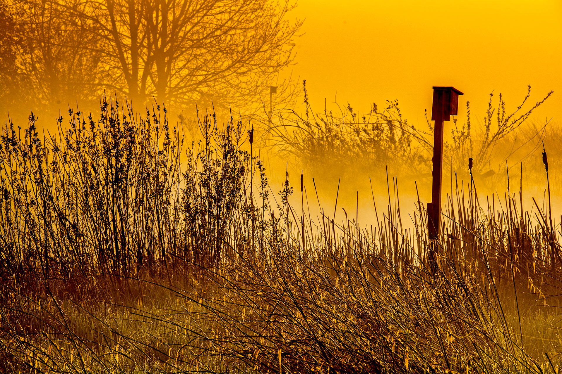 As the warm morning sun rose over the mountains, the rays hit the fog that remained over the marshes and everything exploded into shades of golden yellow glow.