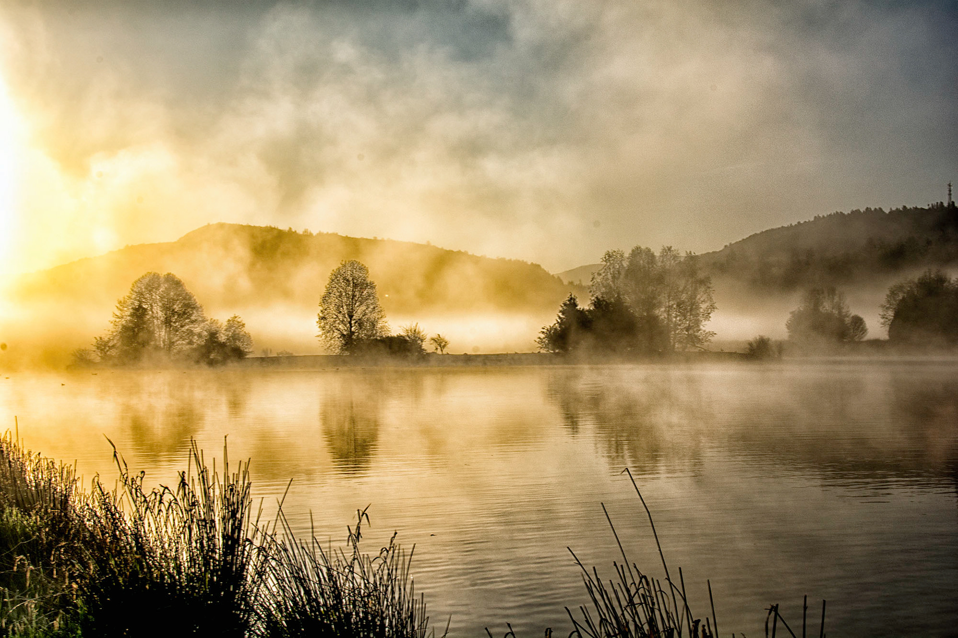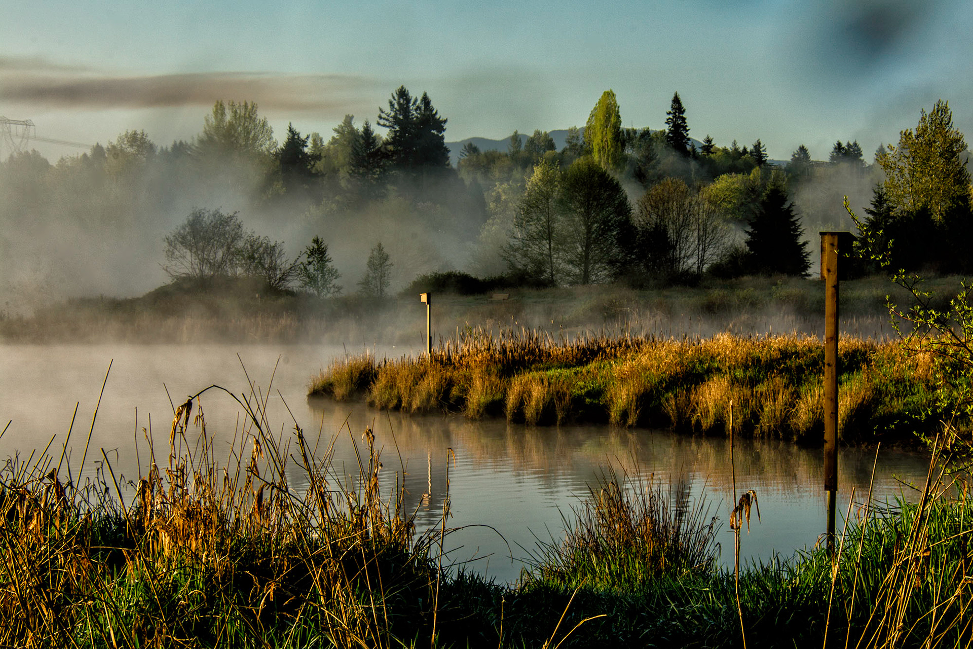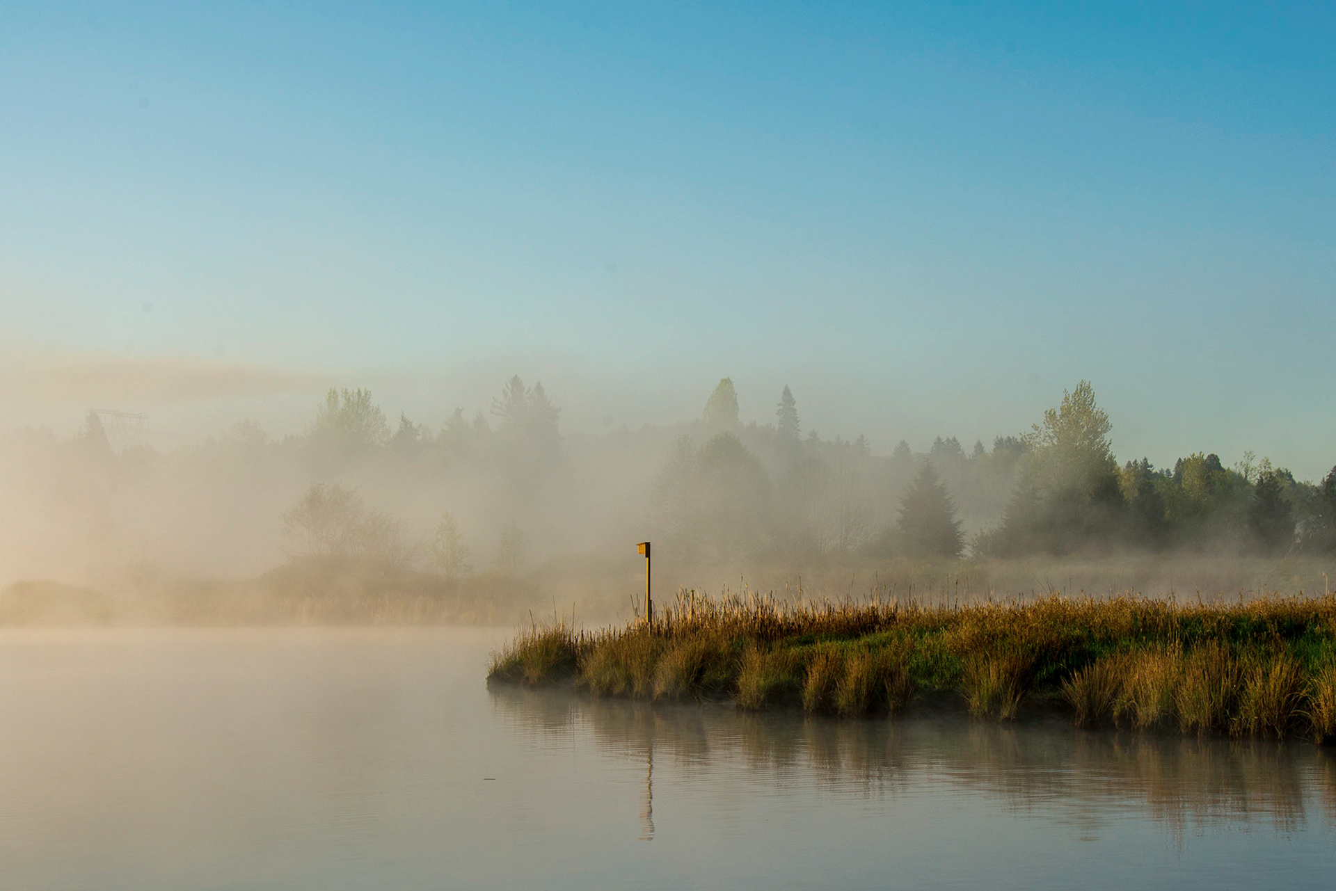 As the warm morning sun rose over the mountains, the rays hit the fog that remained over the marshes and everything exploded into shades of golden yellow glow.